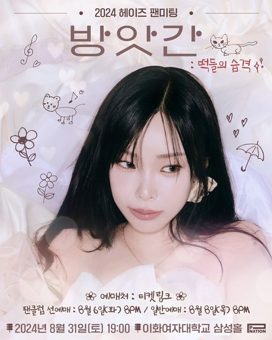소속사 피네이션(P NATION)은 헤이즈의 단독 팬미팅 '2024 헤이즈 팬미팅 [방앗간 : 떡들의 습격]'이 8월 31일 오후 7시 이화여자대학교 삼성홀에서 열린다고 밝혔다.