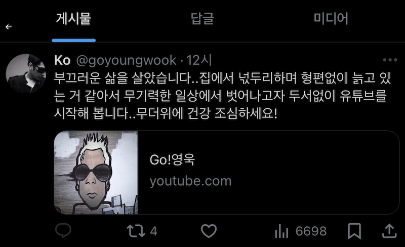 고영욱은 5일 자신의 X(구 트위터) 계정을 통해 "부끄러운 삶을 살았다"며 "무기력한 일상에서 벗어나고자 유튜브를 시작한다"고 밝혔다. 그는 'Go!영욱'이라는 이름의 유튜브 채널을 통해 첫 영상을 게재했으며, 6일 오후 1시 40분 기준 563명의 구독자를 확보했다.