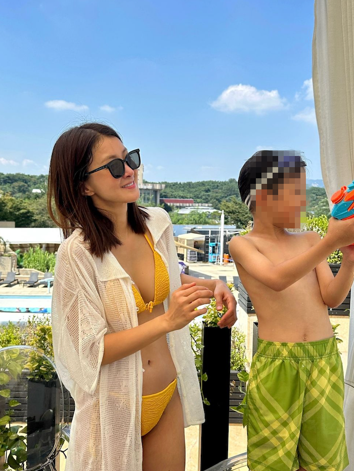 공개된 사진 속 이시영은 아들과 함께 커플 수영복을 입고 수영장을 방문한 모습이다. 그녀는 노란색 비키니를 착용해 트렌디하면서도 사랑스러운 분위기를 자아냈다. 비키니와 같은 색상의 가방과 선글라스를 매치해 스타일리시한 비치웨어를 완성했다.