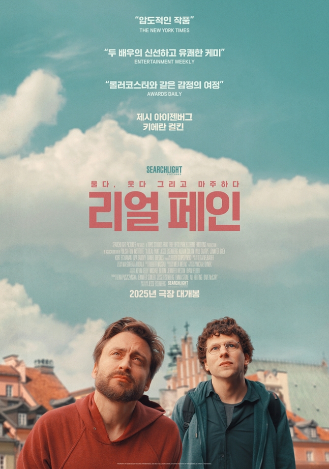 제시 아이젠버그가 감독을 맡은 *리얼 페인*은 상반된 성격을 가진 두 사촌, 데이비드(제시 아이젠버그)와 벤지(키에란 컬킨)가 할머니의 죽음을 기리기 위해 떠난 폴란드 여행에서 겪는 웃음과 감동을 그린 작품이다. 이 영화는 오는 10월 2일부터 11일까지 열리는 제29회 부산국제영화제의 월드 시네마 섹션에 공식 초청되어 국내 팬들의 기대를 모으고 있다.
