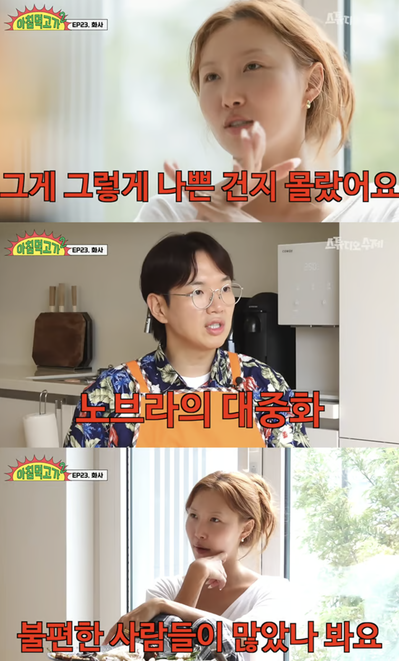 화사는 24일 유튜브 예능 프로그램 '아침 먹고 가'에 출연해 가장 예상치 못했던 이슈로 '노브라 논란'을 언급했다. 화사는 "어릴 때부터 속옷을 입으면 불편했다"며 "언제까지 속옷을 입고 다녀야 할지 고민하다가 비공식적인 자리에서 속옷을 입지 않기 시작했다. 당시에는 그게 큰 문제가 될지 몰랐다"고 회상했다. 이어 "이제는 그 인식도 많이 유연해진 것 같다"고 덧붙였다.
