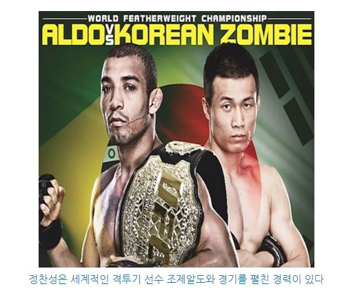 사진 속 남자는 '코리안 좀비'라는 별명을 갖고 있는 격투기 선수 '정찬성'이다. 정찬성 선수는 한국인 최초로 UFC 타이틀전 매치를 치룬 선수로 UFC 팬들 사이에선 유명한 선수이다.