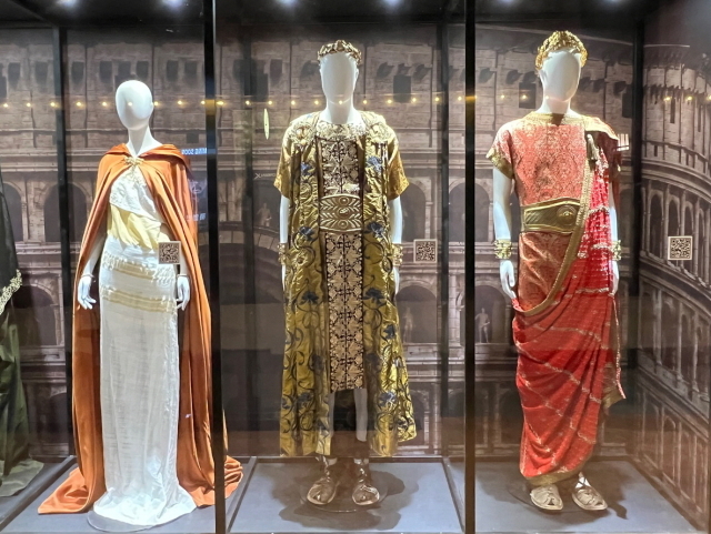 특히 이번 전시에서 눈길을 끄는 것은 각 캐릭터의 개성을 반영한 의상들이다. 루시우스의 의상은 고대 로마의 검투사 복식을 기반으로 제작되어 전투력을 강조하며, 로마의 장군으로서 시민들에게 추앙받는 아카시우스(페드로 파스칼)의 의상은 영웅의 품격을 나타낸다. 또한, 검투사들의 주인인 마크리누스(덴젤 워싱턴)는 녹색 가운과 금빛 장신구를 착용해 권력욕이 강한 인물을 표현했고, 공주 루실라(코니 닐슨)의 의상은 세련미를 갖춘 심플한 디자인으로 우아함을 더한다. 여기에 폭군 황제 게타(조셉 퀸)와 카라칼라(프레드 헤킨저)의 화려한 의상은 금빛 장신구와 눈부신 디테일로 압도적인 분위기를 연출한다.