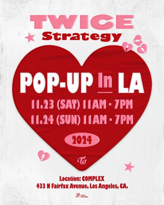 이어 23일부터 24일까지 미국 로스앤젤레스 COMPLEX에서 신보 발매 기념 팝업 스토어 'TWICE "STRATEGY" POP-UP'을 개최했다. 양일간 준비된 모든 MD 상품이 완판되며 폭발적인 인기를 실감케 했으며, 멤버들이 직접 현장을 찾아 팬들과 만남을 가졌다.