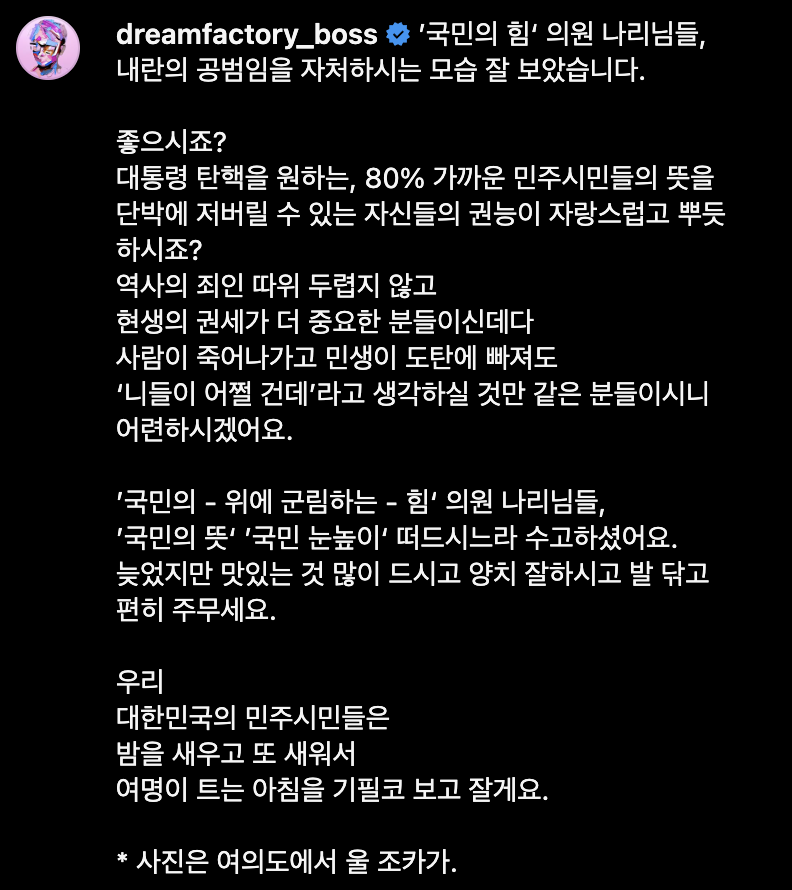 그는 국민의힘 의원들을 "국민의 - 위에 군림하는 - 힘 의원 나리님들"이라고 지칭하며, "늦었지만 맛있는 것 많이 드시고 편히 주무시라"고 비꼬았다. 이어 "우리 민주 시민들은 밤을 새워서라도 반드시 여명이 트는 아침을 볼 것"이라고 덧붙이며 결연한 의지를 밝혔다.