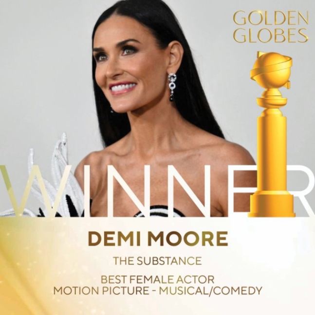 배우 데미 무어가 영화 ‘서브스턴스’로 골든글로브 여우주연상 트로피를 거머쥐며 생애 첫 연기상을 수상했다.