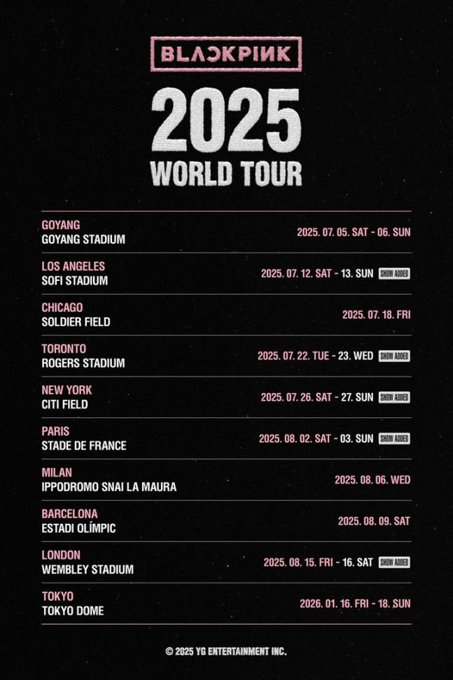 이로써 블랙핑크는 2025 월드투어를 통해 총 10개 도시에서 18회차 공연을 펼치게 됐다. 이들은 이미 7월 5일 고양종합운동장 주경기장에서 투어를 시작으로, 12일 로스 앤젤레스, 18일 시카고, 22일 토론토, 26일 뉴욕, 8월 2일 파리, 6일 밀라노, 9일 바르셀로나, 15일 런던, 내년 1월 16~18일 도쿄 등 다양한 도시에서 팬들과 만날 예정이다.
