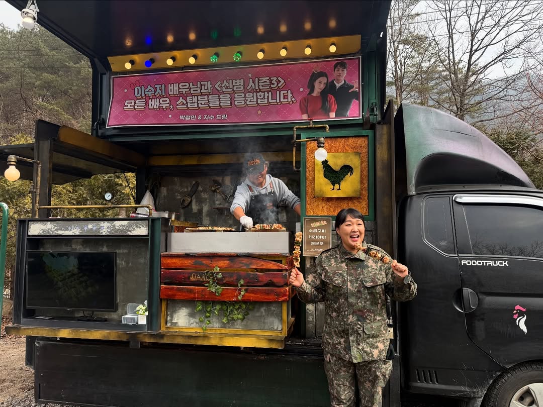 28일, 이수지는 자신의 인스타그램에 "정민 지수님 고마워용♥"이라는 글과 함께 간식차 인증 사진을 여러 장 공유했다. 해당 간식차는 박정민과 지수가 이수지의 ENA, 지니TV 드라마 ‘신병3’ 출연을 응원하기 위해 보낸 것으로 알려졌다. 사진 속 이수지는 군복을 입고 여군 중사로 변신해 닭꼬치를 들고 있는 모습으로 눈길을 끌었다.