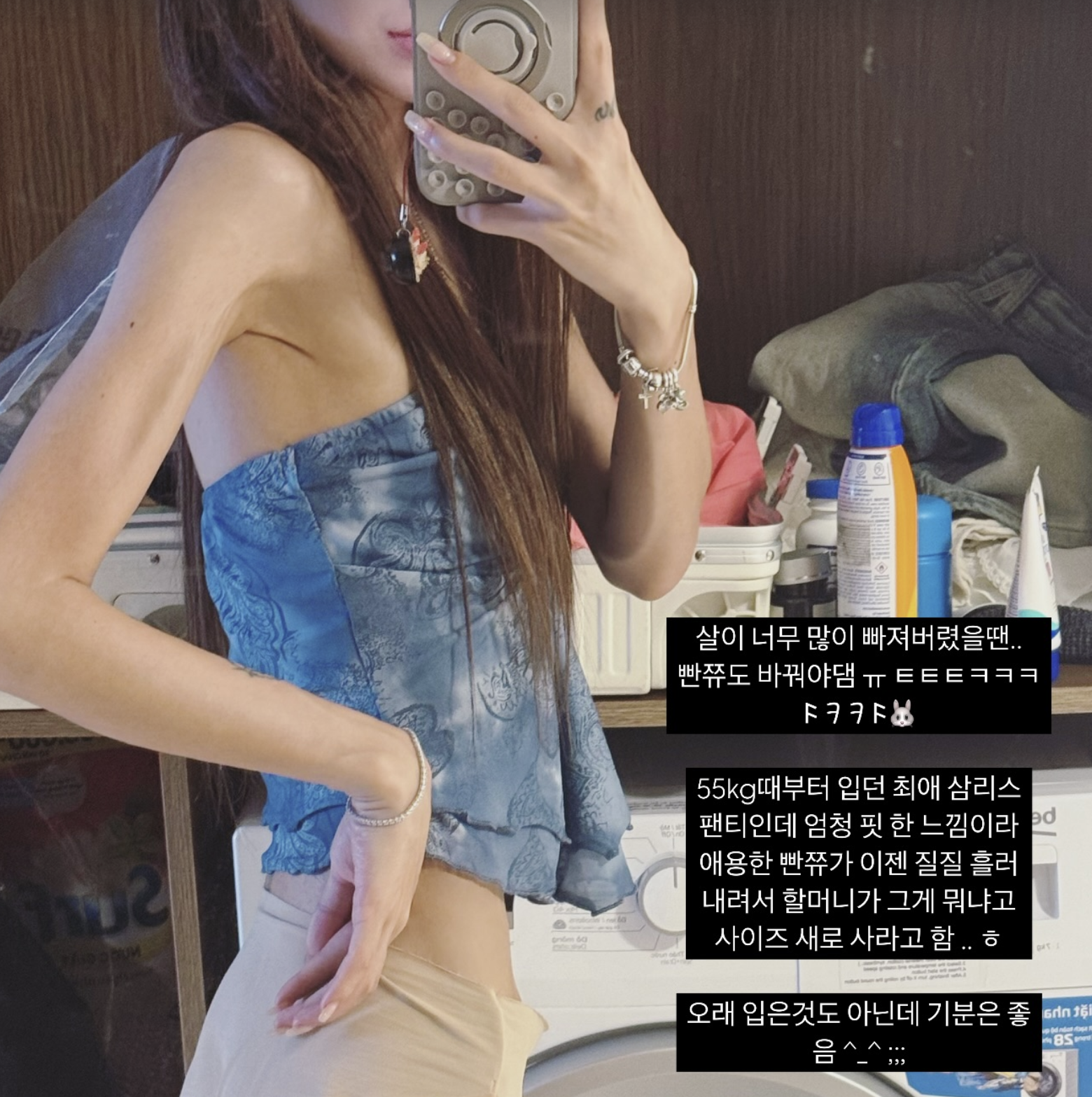 그녀는 이어 "55kg 때부터 입던 최애 심리스 팬티인데 엄청 핏한 느낌이라 애용한 빤쮸가 이젠 질질 흘러 내려서 할머니가 그게 뭐냐고 사이즈 새로 사라고 함. 오래 입은 것도 아닌데 기분은 좋음"이라고 전하며, 다이어트 성공에 대한 만족감을 드러냈다.