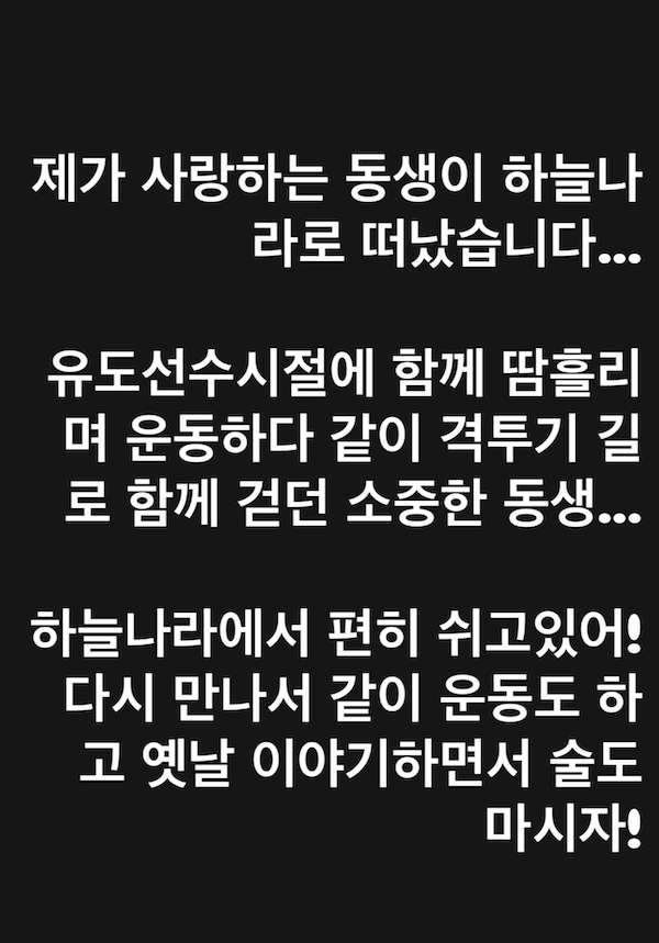 추성훈은 20일 자신의 SNS를 통해 "제가 사랑하는 동생이 하늘나라로 떠났다"라고 안타까운 소식을 알렸다. 그는 이어 "유도 선수 시절 함께 땀 흘리며 운동했고, 이후 격투기 길도 함께 걸었던 소중한 동생"이라며 "하늘나라에서 편히 쉬길 바란다. 다시 만나 함께 운동도 하고 옛날 이야기하며 술도 마시자"는 애틋한 마음을 전했다.