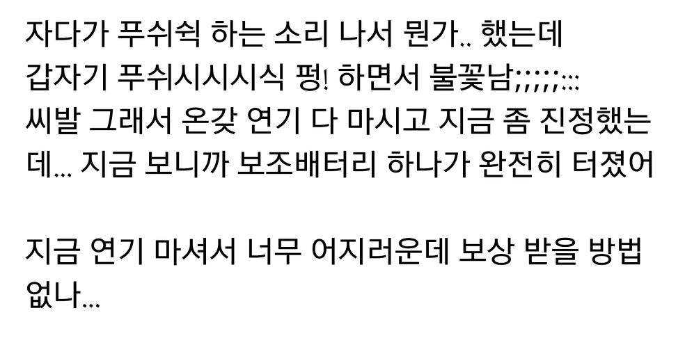 연기를 들이 마시고 두려움과 고통으로 놀란 가슴을 진정시키기 어려웠던 사용자는 아직도 진정이 안된 듯 세세한 후기를 올리고 있는 중이고 보상을 어떤 식으로 받아야할 지를 묻고 있는 상황이다.