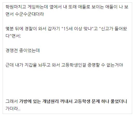 위기상황에서 그는 고등학생용 문제를 척척 풀어내 고등학생임을 증명했고 무사히 넘어갈 수 있었다.