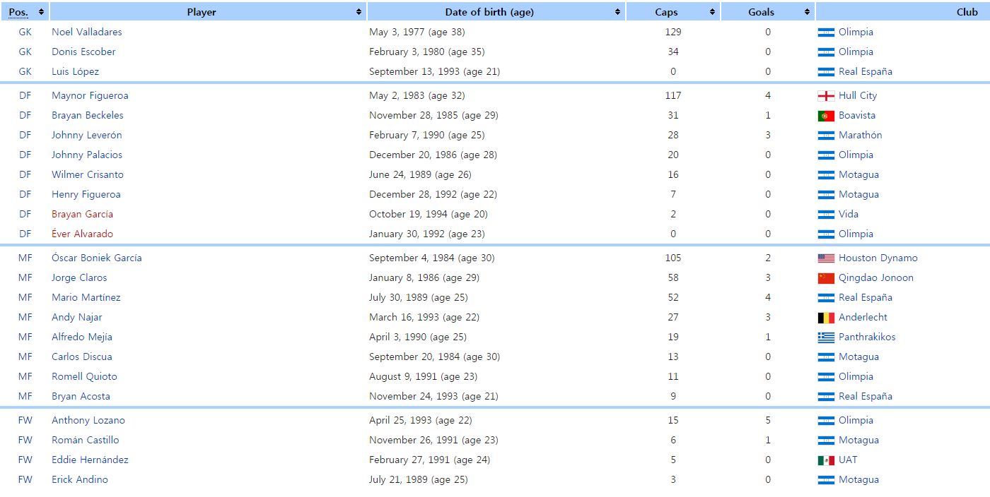 온두라스는 최근 A매치서 1승2무2패를 기록 중이다. 멕시코, 파라과이와 무승부를 거뒀고 브라질에 0-1로 석패했을 정도로 쉽게 지지 않는 팀 컬러를 지니고 있다. 미드필드, 수비진에 경험 많은 베테랑 선수들이 여럿 있는데 EPL서 검증된 DF 피게로아(헐시티)가 수비 핵이다. MF 마르티네즈(에스파냐) 나자르(안더레흐트) 등이 허리 중심을 잡아주고 있으며 공격진은 어린 선수들이 많다는 특징이 있지만 FW 로차노(올림피아)가 A매치 15경기 5골을 넣고 있다.
