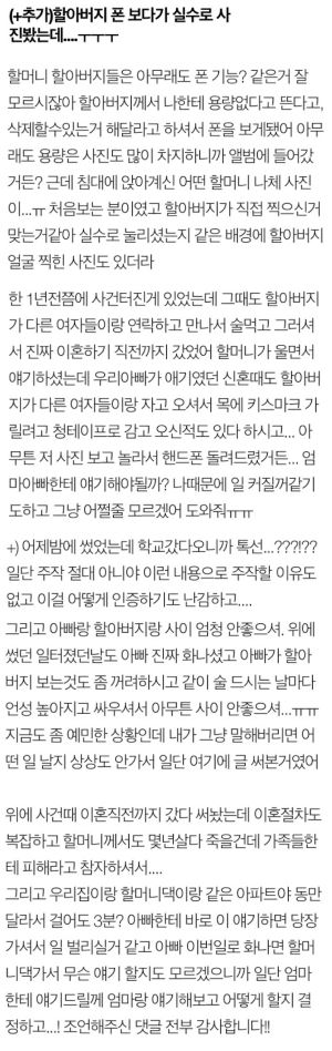 지난 27일 한 온라인 커뮤니티에는 '할아버지 폰 보다가 실수로 사진봤는데...'라는 제목의 글이 올라왔다.