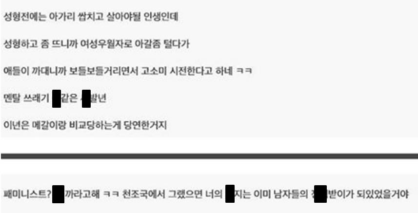 서유리가 공개한 악플들에는 온갖 비속어와 성적인 표현들이 들어 있어 충격을 주고 있다. 서유리가 받은 악플들은 다음과 같다.