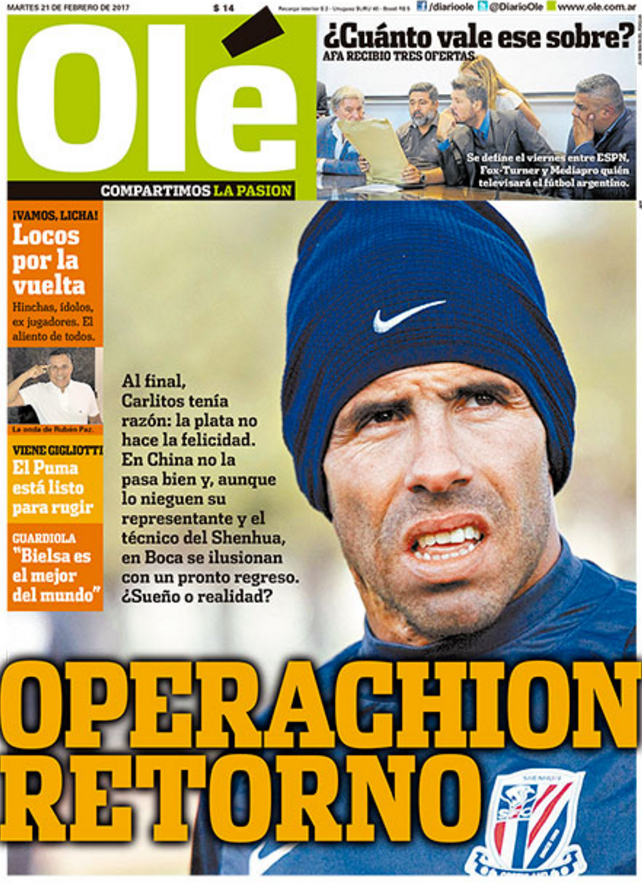 그런데 최근 아르헨티나 신문은 테베스의 근황을 전하며 그가 또 향수병에 걸린 것 같다고 보도했다. 테베스는 중국에서 행복하지 않고 이 때문에 보카 주니어스의 테베스의 영입을 추진할 것이라는 보도다.