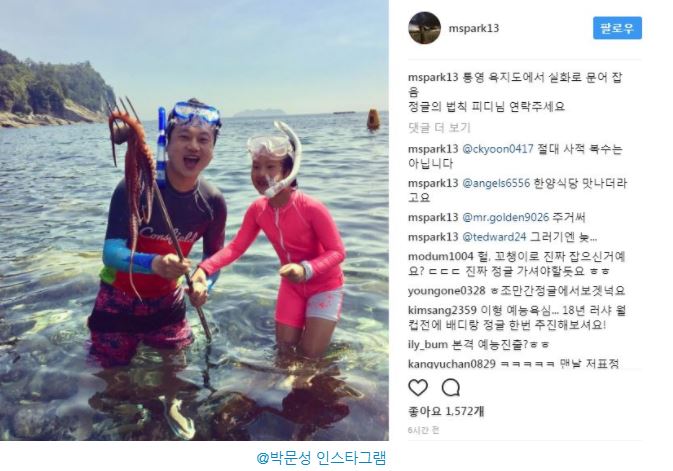 사진 속 박 의원은 "통영 욕지도에서 실화로 문어 잡음"이라고 글을 올리면서 즐거운 표정으로 "정글의 법칙 피디님 연락주세요"라고 센스있는 멘트를 남겼다.