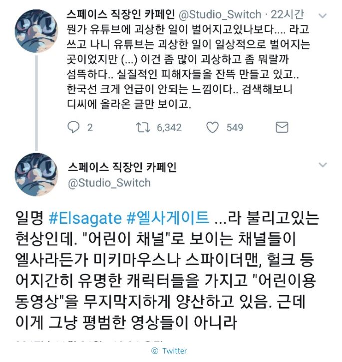 이 이용자의 말에 따르면 '최근 유튜브에서 "어린이 채널"로 보이는 채널들이 엘사, 미키마우스, 스파이더맨 등 유명한 만화 캐릭터들을 가지고 "어린이용 동영상"을 무지막지하게 양산한다'고 말했다.