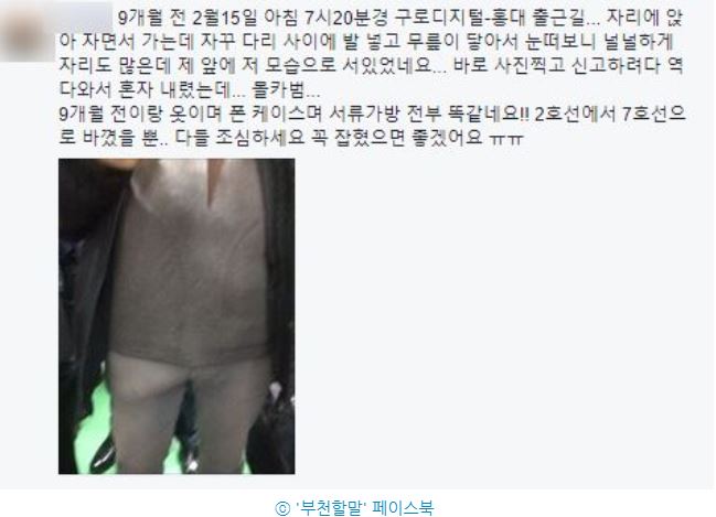 '부천할말' 페이지 관리자는 댓글을 남겨 제보자에게 "혹시 저분을 지하철 1호선에서 다시 보신다면 서울지방철도경찰대로 연락 바란다"고 전했다.