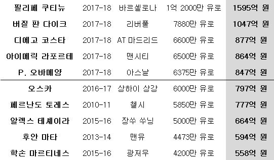 오바메앙의 이적료는 6375만유로(한화 847억원)에 이른다. 역대 겨울이적 시장 이적료로 따지면 5위에 해당하는 금액이다. 그런데 앞선 1~5위가 모두 이번 겨울 이적시장에 성사됐다. 리버풀에서 바르셀로나로 떠난 MF 필립 쿠티뉴가 1위로 이적료는 무려 1억 2천만유로에 이른다.