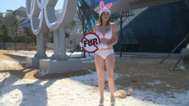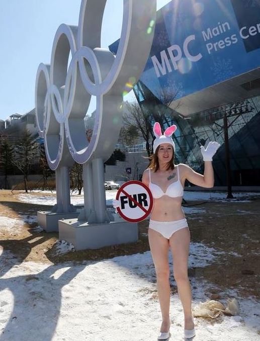 지난 6일 오후 강원도 평창 알펜시아 리조트 안에 위치한 메인프레스센터(MPC) 앞에서 한 여성이 옷을 입지 않고 '모피 반대'시위를 했다.