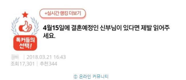지난 21일 한 온라인 커뮤니티에는 "4월15일에 결혼예정인 신부님이 있다면 제발 읽어달라"며 한 게시물이 올라왔다.