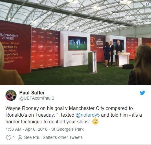 출처는 UEFA 여자축구 관련 담당자 폴 사퍼. 그는 자신의 SNS에 루니가 퍼디난드에게 보낸 문자 내용에 호날두의 시저스킥과 자신의 시저스킥을 비교했다고 말해 관심을 끌었다.