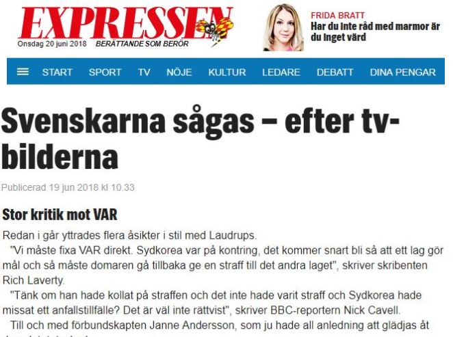 다른 외신들도 이번 스웨덴 전에서 심판의 미숙한 VAR 운용 능력을 문제로 삼고 있다.