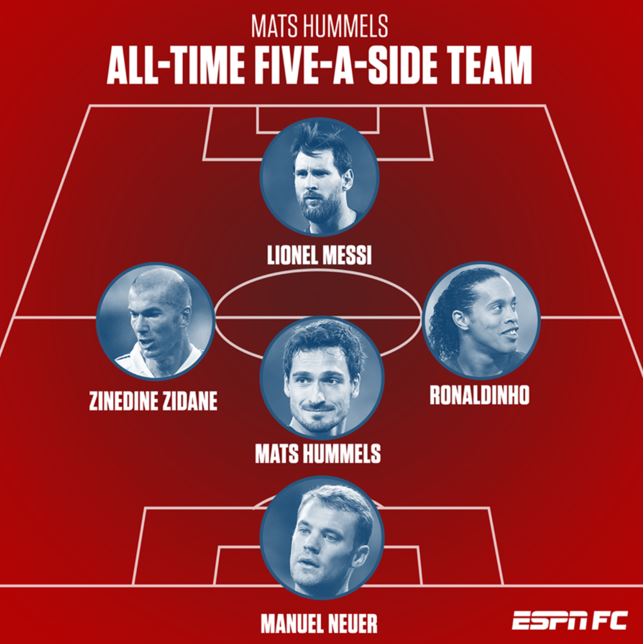 바이에른 뮌헨 수비수 마츠 훔멜스(29)가 역대 축구 선수들로 5인 드림팀을 꼽았다.