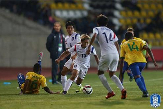2015년 FIFA(국제축구연맹) 17세 이하 월드컵 개최국 칠레 언론이 한국의 브라질전 승리를 비중 있게 보도했다. 한국은 18일(이하 한국 시간) 칠레 코킴보 시립 경기장에서 열린 17세 이하 월드컵 조별리그 B조 1차전에서 후반 34분 장재원(현대고)의 결승골로 브라질을 1-0으로 꺾었다. 승점 3의 한국은 1-1로 비긴 잉글랜드와 기니(이상 승점 1)를 제치고 조 1위에 올랐다.