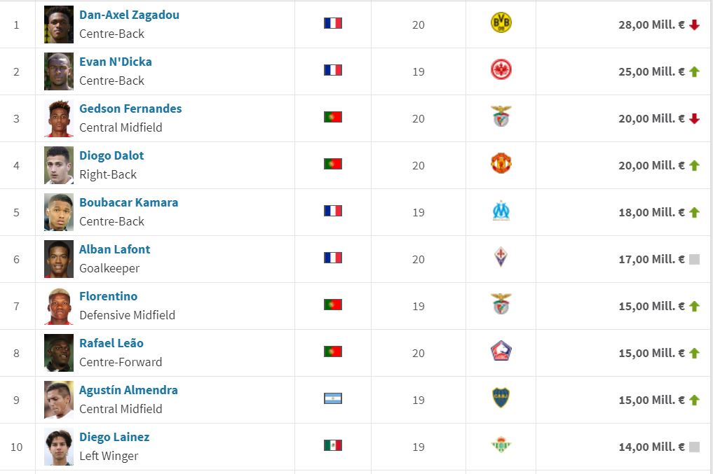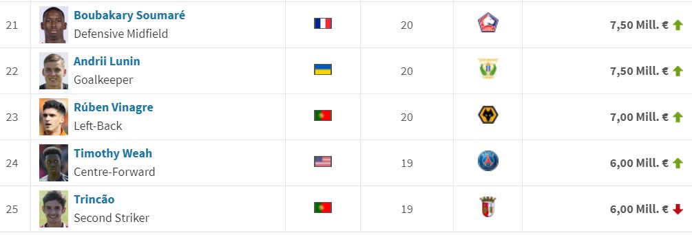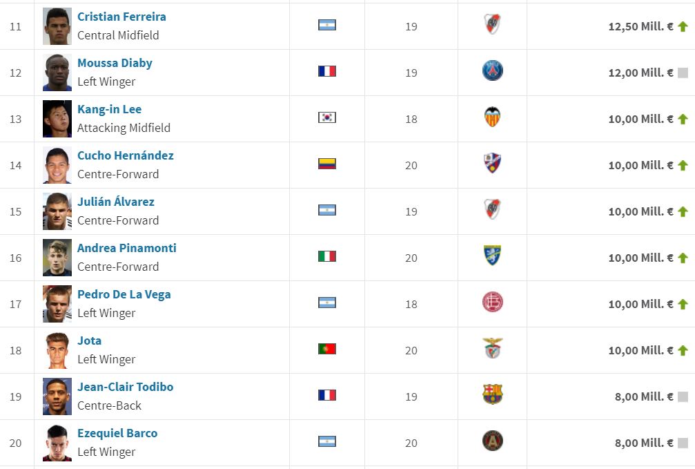 U-20 월드컵 출전 선수 몸 값 Top 25