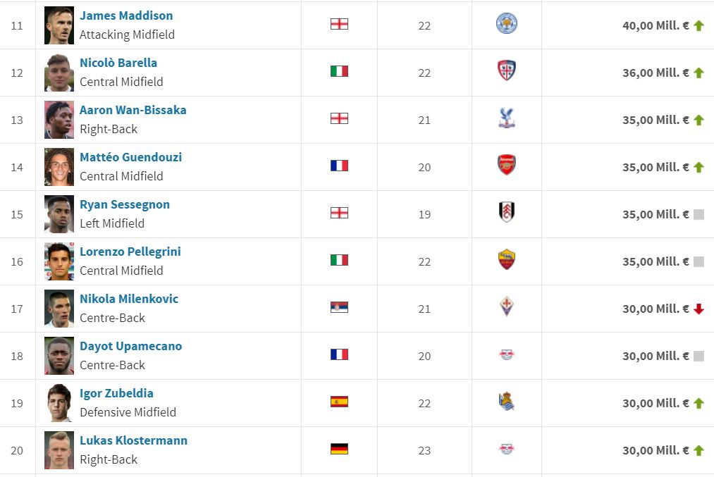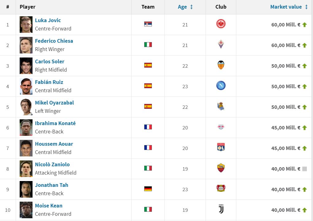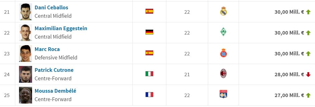 U-21 유로 출전 선수 몸 값 Top 25
