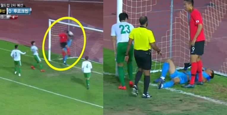 이후 이어진 공격에서 헤딩을 하기 위해 높게 뛴 김신욱 선수와 공중에서 공을 잡은 마메트 오라즈무하메도프(Mamed Orazmuhamedov, 32·Altyn Asyr FK) 골키퍼가 충돌했다.